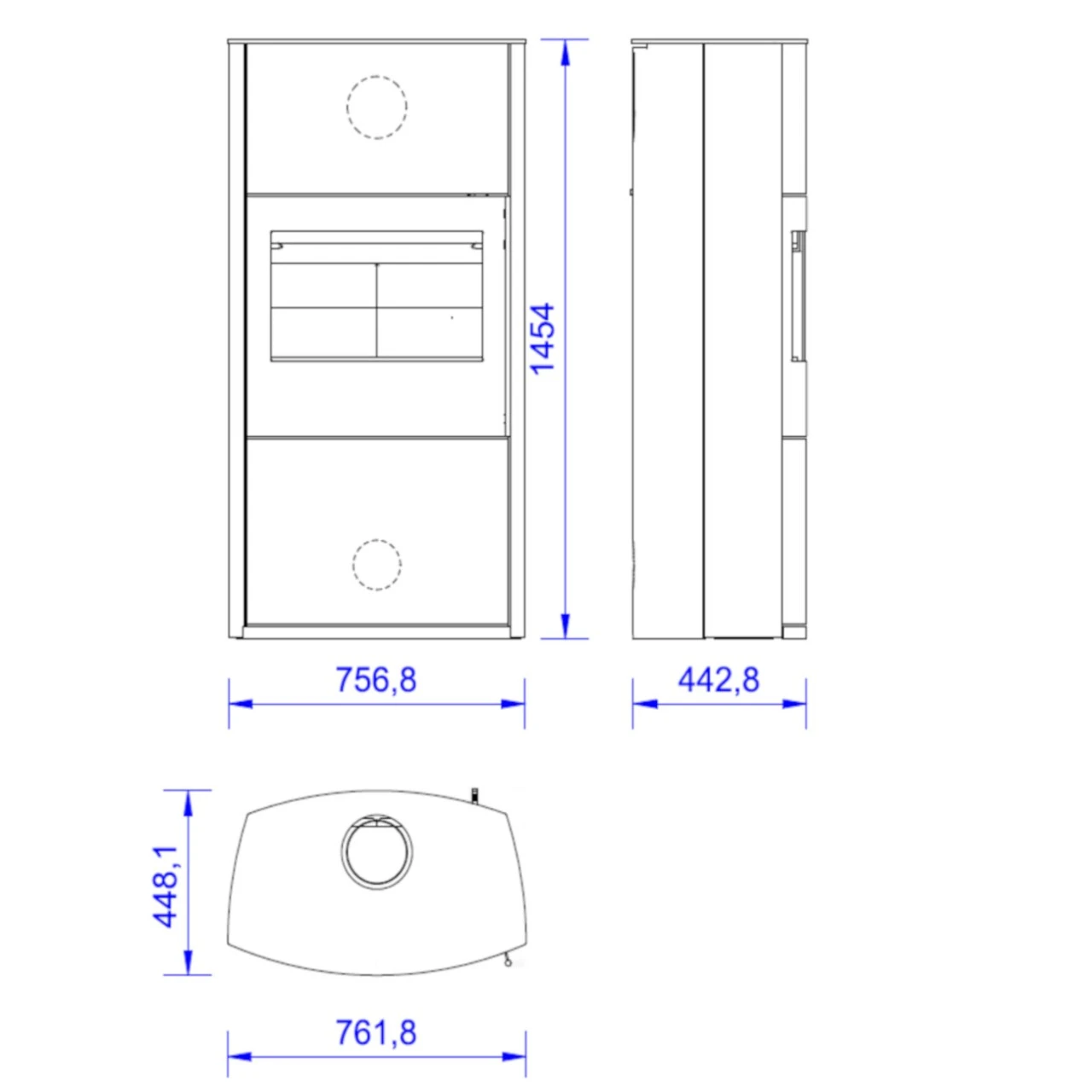 - Abstand von Mitte des Rauchstutzens bis zur Hinterkante des Ofens: 17,4 cm