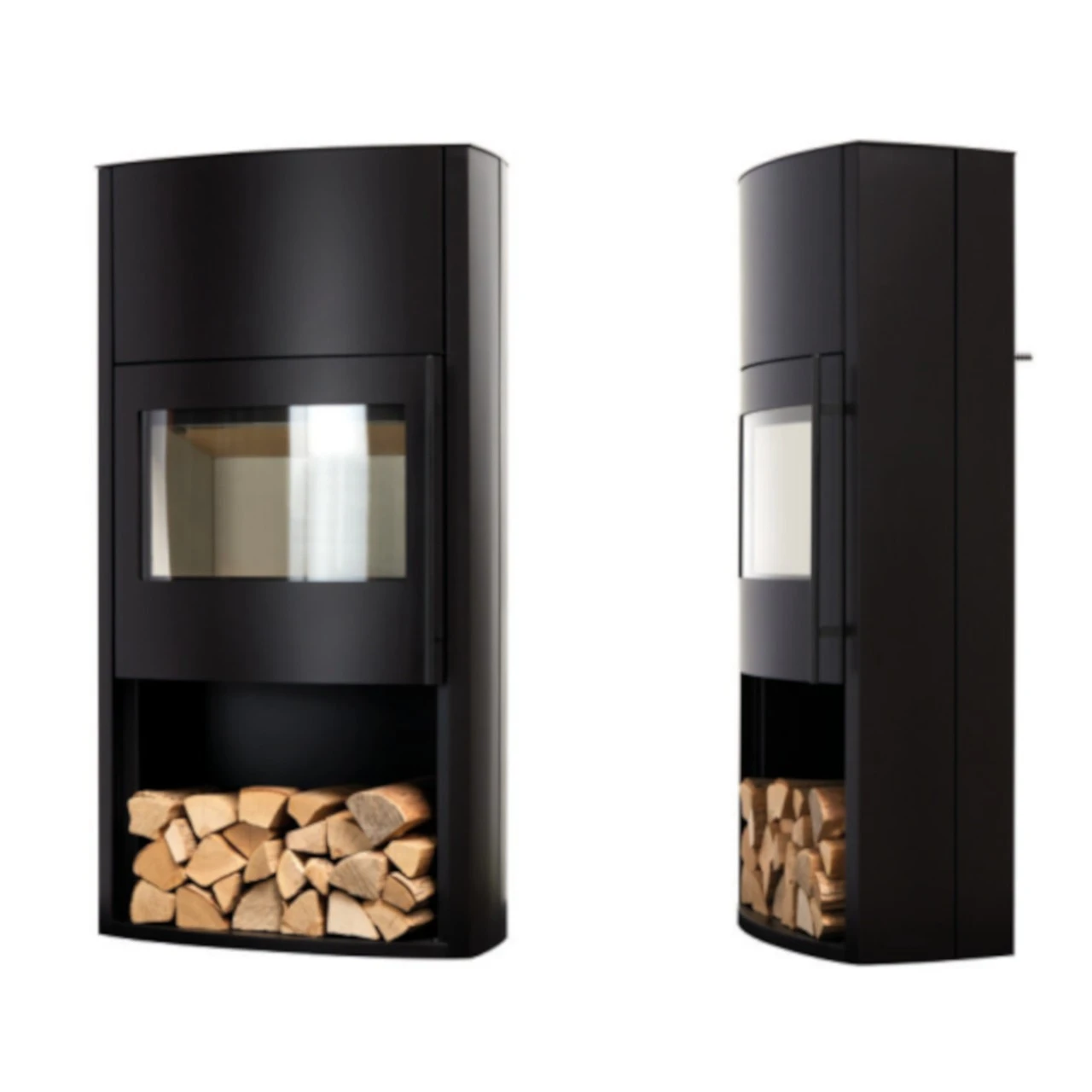 Der Genius glänzt durch seine aufgeräumte Front. Unter der Feuerung ist Platz für Holz – in einem offenen Fach oder hinter der optionalen Holzfachtür. Der Genius bietet eine große Feuereinsicht im Querformat.