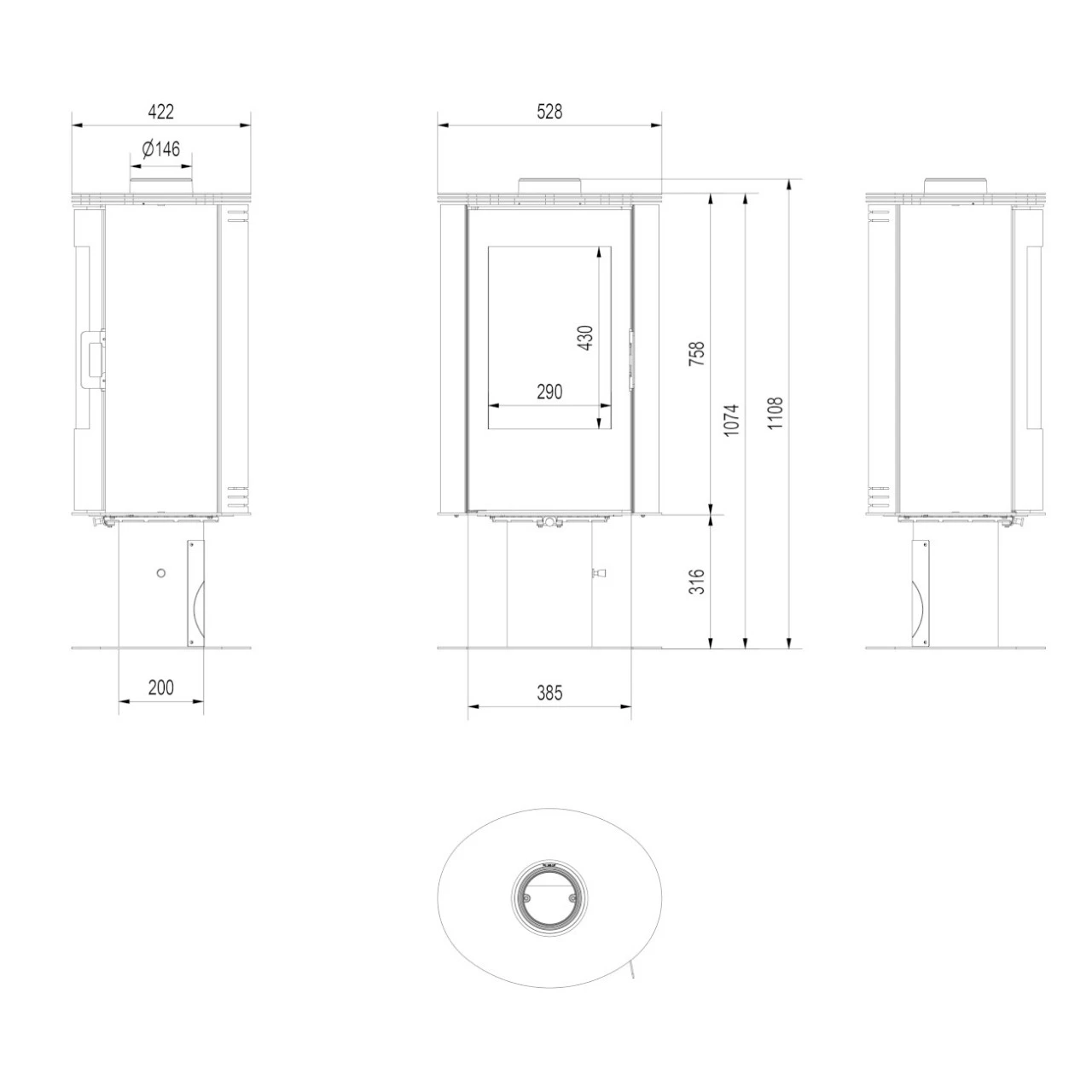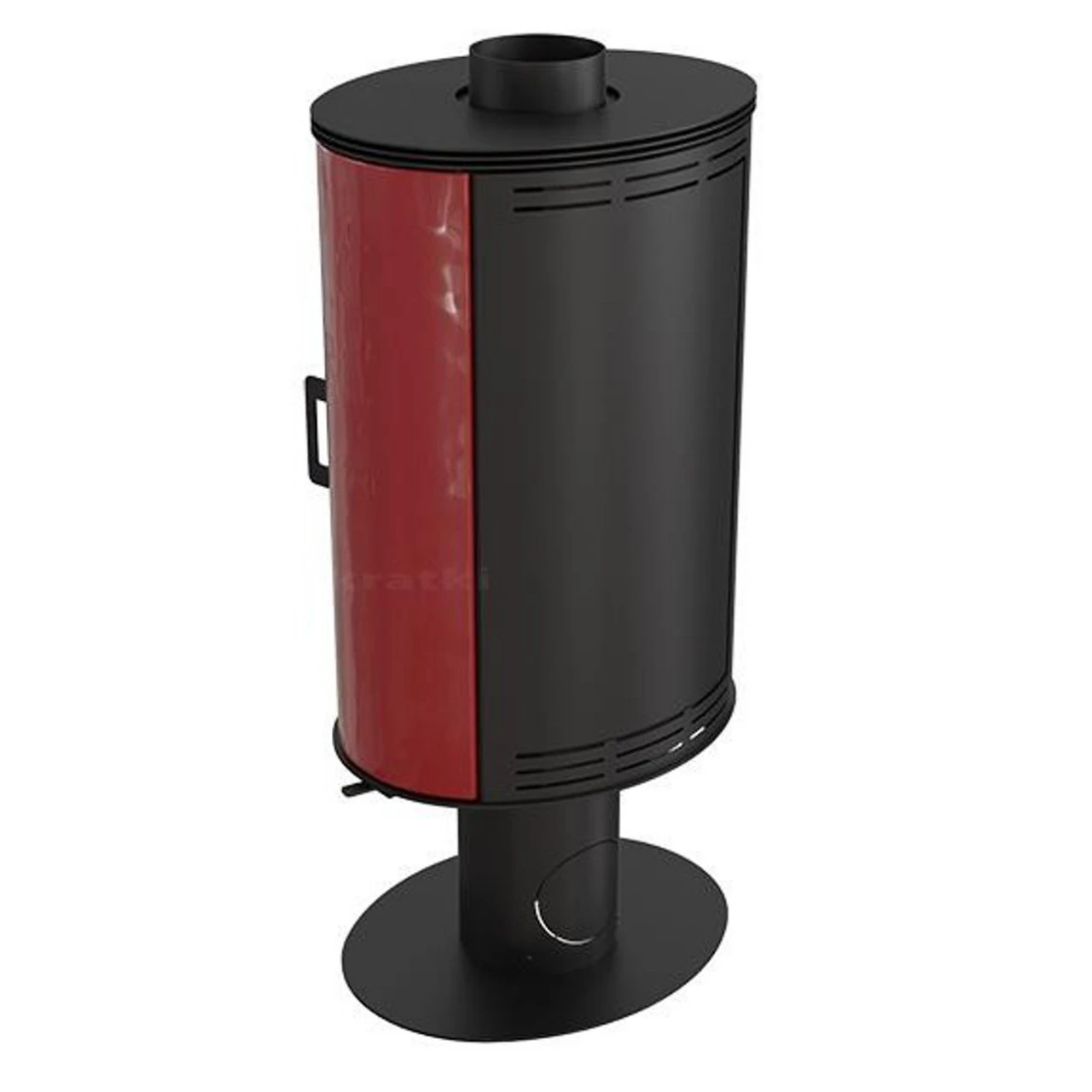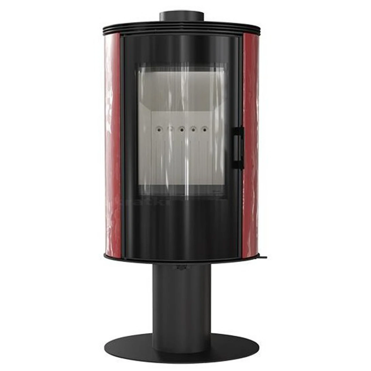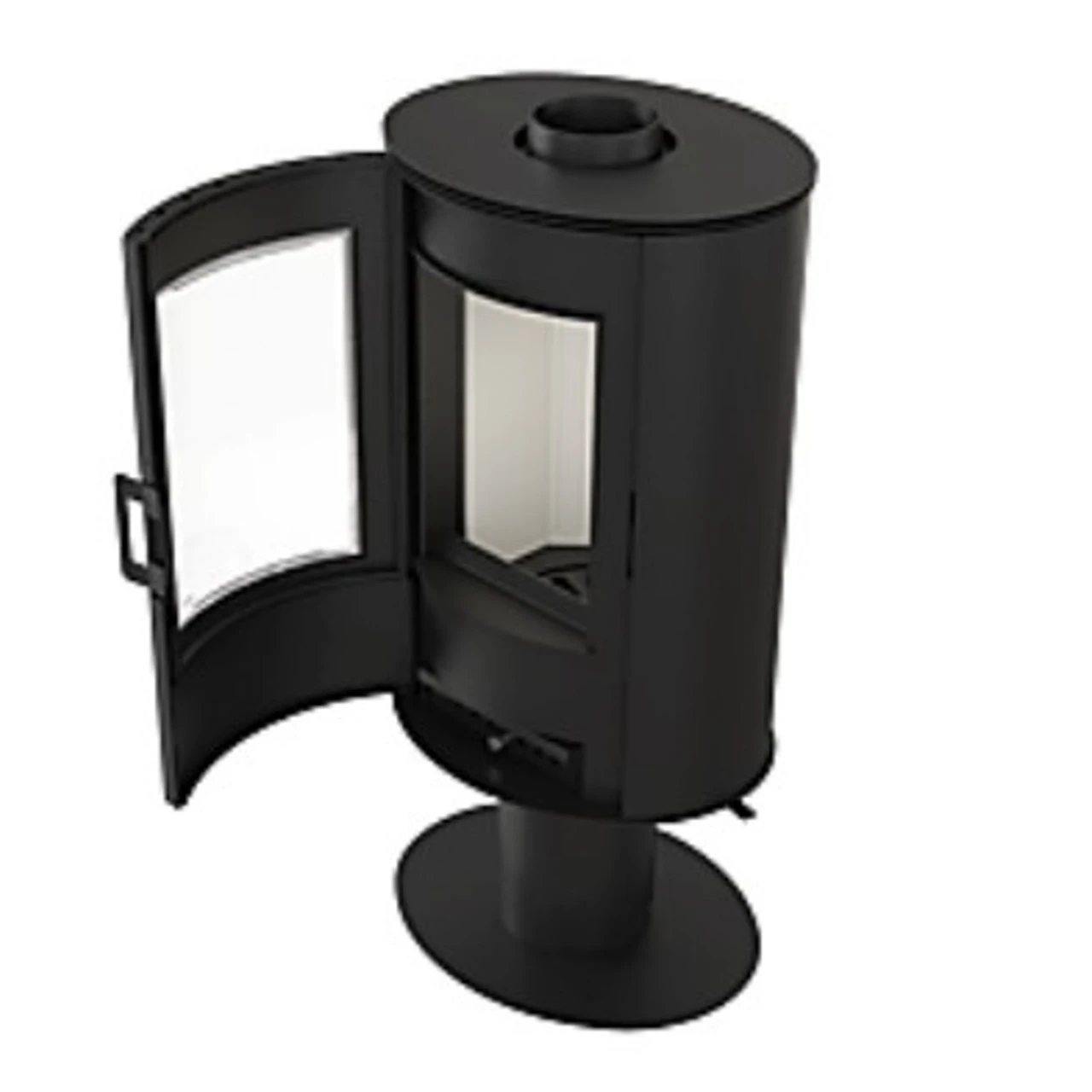 - Kaminofen mit Trompetenfuß. Der Kaminkorpus (oberer Teil) ist um 360° drehbar.