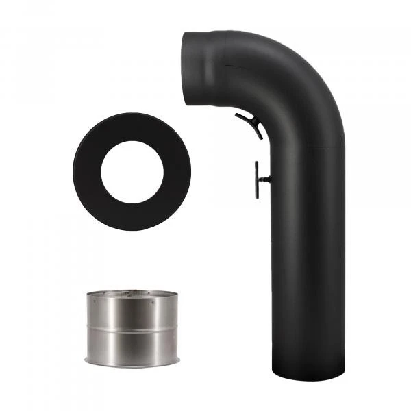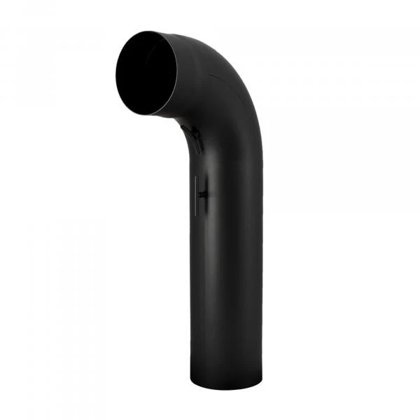 Ein Rohr mit gezogenem Bogen 90° mit Drosselklappe und Reinigungsverschluss zur Verbindung der Feuerstätte mit dem Schornstein. Der verschließbare Reinigungsverschluss dient zum reinigen und überprüfen des waagerechten Rohrteils. Die Drosselklappe dient als als zusätzliche Regulierung des Feuers bei zum Beispiel zu starken Schornsteinzug oder Brennstoffwechsel wie Kohle, Holzbriketts usw..